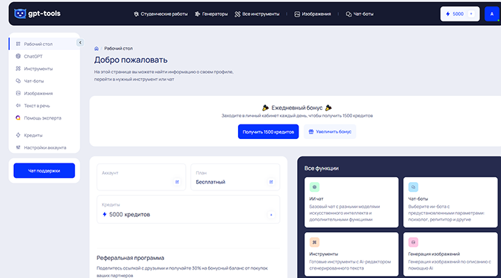 GPT-Tools — это универсальный онлайн-сервис, предлагающий широкий спектр инструментов на основе искусственного интеллекта для работы с текстами, изображениями и задачами различной сложности. Сервис выделяется интеграцией готовых решений, включая генерацию студенческих работ, создание изображений по описанию, текстовые озвучивания и многое другое. Платформа адаптирована для пользователей с различными запросами, предоставляя удобные тарифные планы и расширенные функции для профессионального и образовательного использования.
