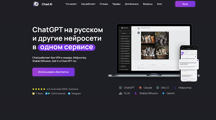 Chad AI — это многофункциональный бот, который объединяет передовые технологии искусственного интеллекта, включая GPT-4o, Claude, Midjourney, и DALL-E. Сервис адаптирован для русскоязычных пользователей, обеспечивая доступ к мощным инструментам генерации текста, изображений и кода. Уникальная особенность — удобство использования без необходимости VPN или иностранной карты. Благодаря готовым шаблонам запросов, платформа помогает эффективно справляться с рутинными задачами и создавать качественный контент.