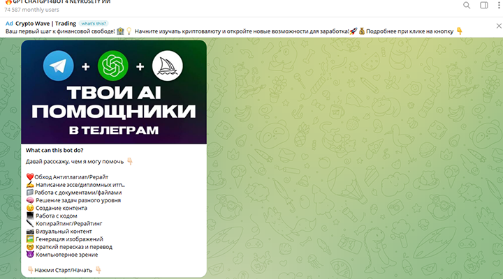 - Универсальность: бот поддерживает широкий спектр текстов, от научных статей до SEO-описаний, делая его полезным для студентов, журналистов и маркетологов.