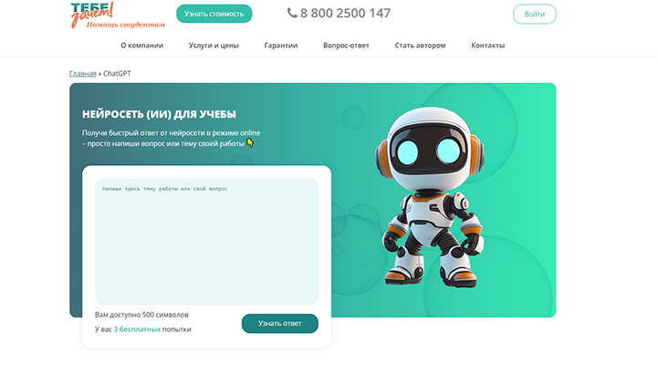 Tebezachet GPT — это онлайн-бот на основе искусственного интеллекта, предназначенный для помощи студентам в написании учебных работ. Нейросеть генерирует текст для рефератов, сочинений, эссе и даже дипломных работ, предоставляя удобный и быстрый способ подготовки материалов. Используя методы обработки естественного языка, Tebezachet GPT анализирует запросы и создает структурированные и релевантные ответы, ориентированные на учебные задачи.